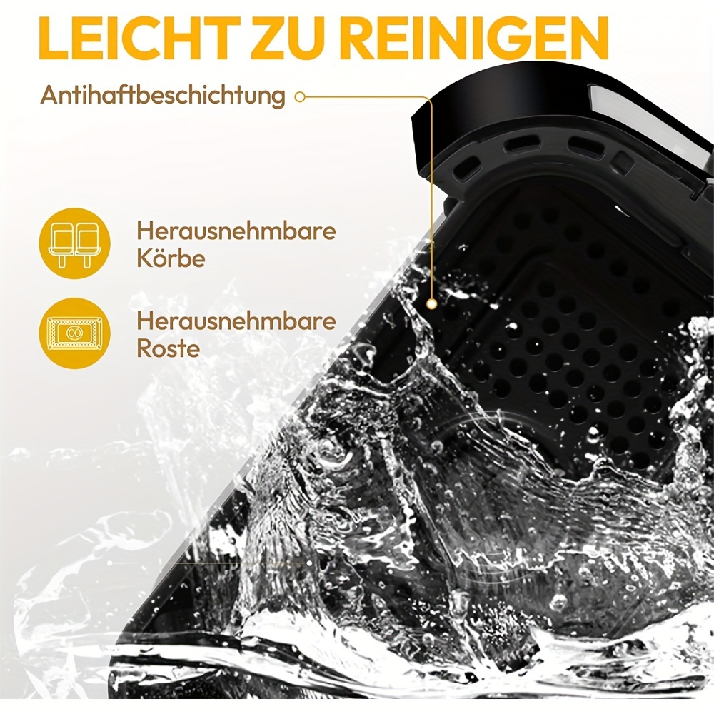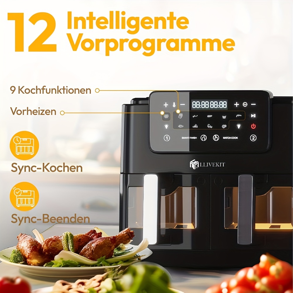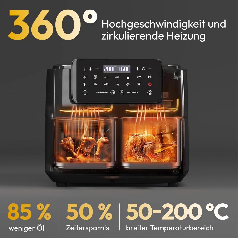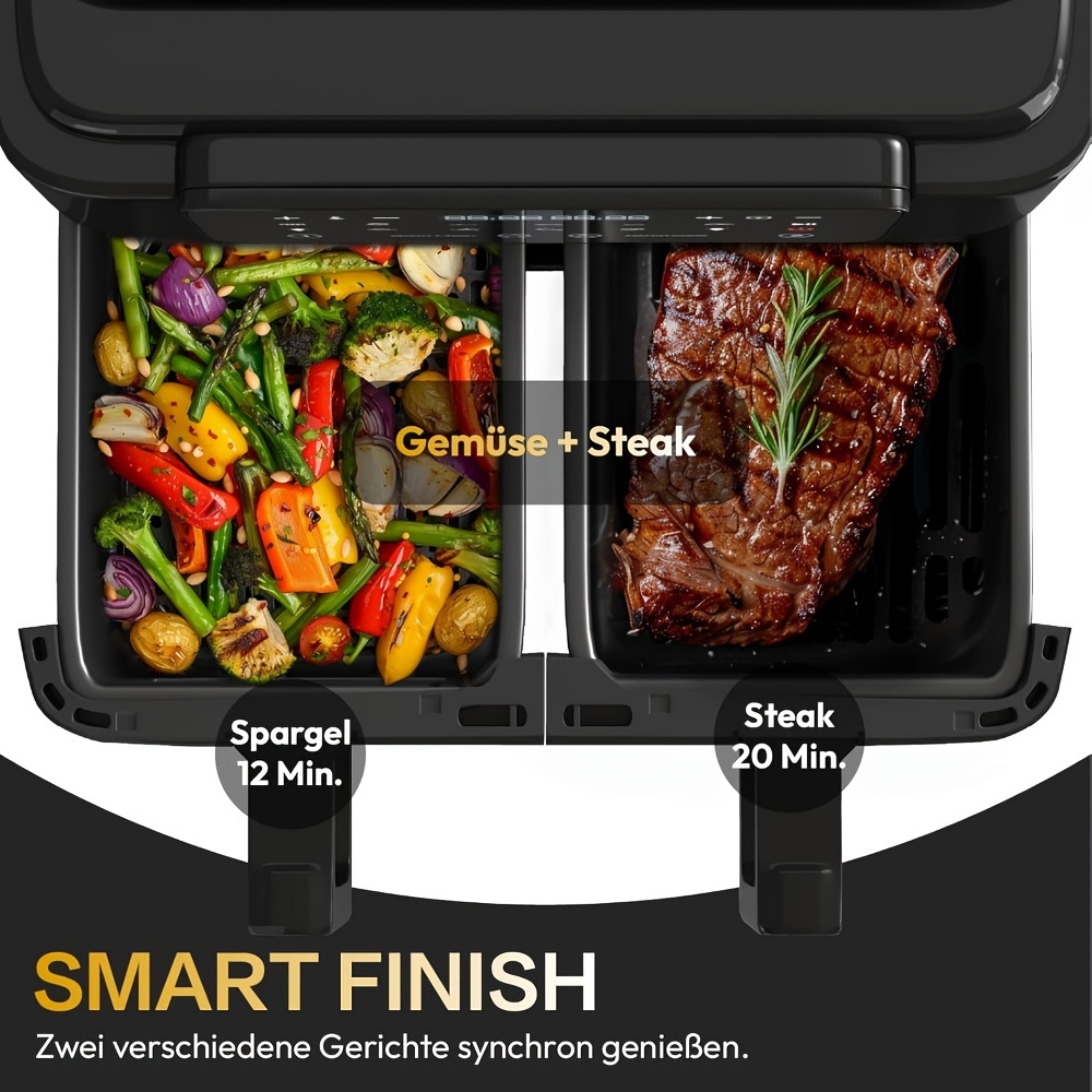 1 pièce, Friteuse à Air Chaud Double Zone avec Fenêtre de Visualisation, Friteuse à Air XXL 9L Sans Huile, Friteuse à Air avec 9 Réglages de Cuisson en 1, 2 Tiroirs, Écran Tactile, Fonction Intelligente et Minuterie, Friteuse Saine et Pauvre en Graisses