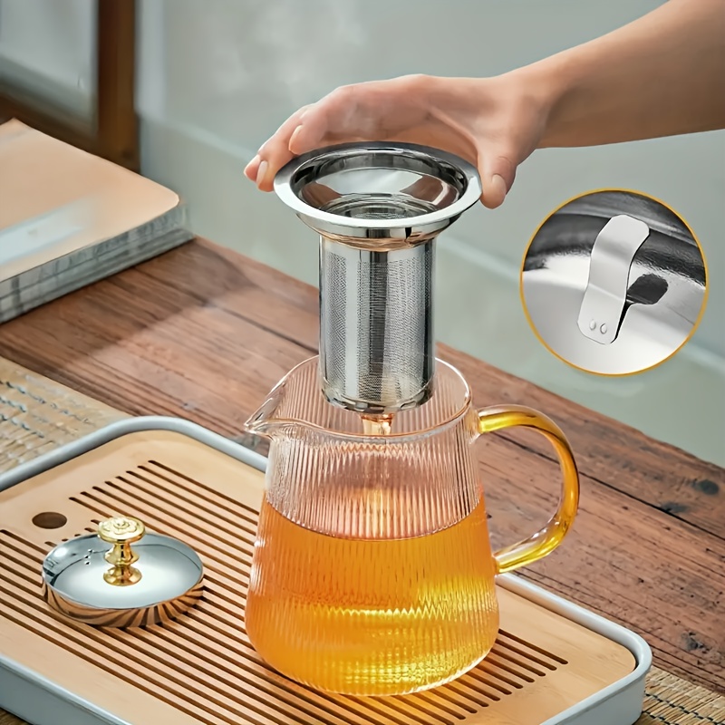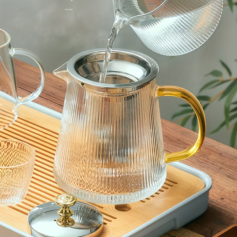 1 théière en verre transparent rayé de 15/18.6/25/32 oz avec couvercle doré, théière en verre épaissi résistant aux hautes températures, bouilloire à filtre en acier inoxydable pour la maison, grande capacité pour le thé à la fleur et le thé.