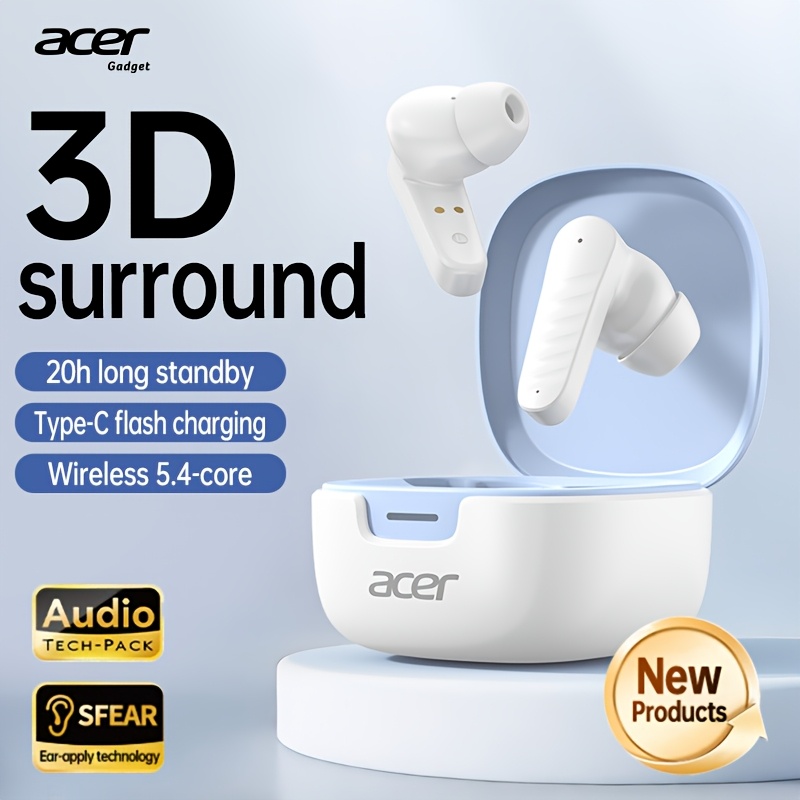 Écouteurs sans fil ACER OHR503, Autonomie prolongée, Audio surround haute définition, Suppression du bruit pour les appels, Faible latence, Compatibles avec plusieurs appareils, Légers et confortables, Commandes tactiles et chargement rapide, Compacts et portables
