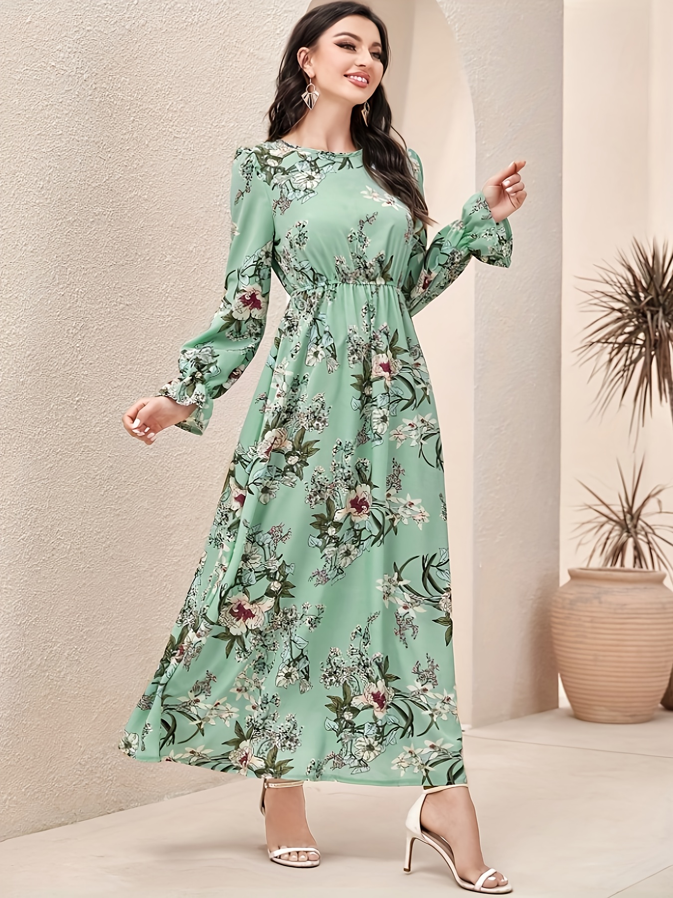 Ensemble de robe trapèze à imprimé floral pour femme – Manches longues, boutonnée avec détail à volants, imprimé floral vert clair, style décontracté, port à toutes les saisons, vêtements décontractés | Robe à imprimé floral | Robe à volants