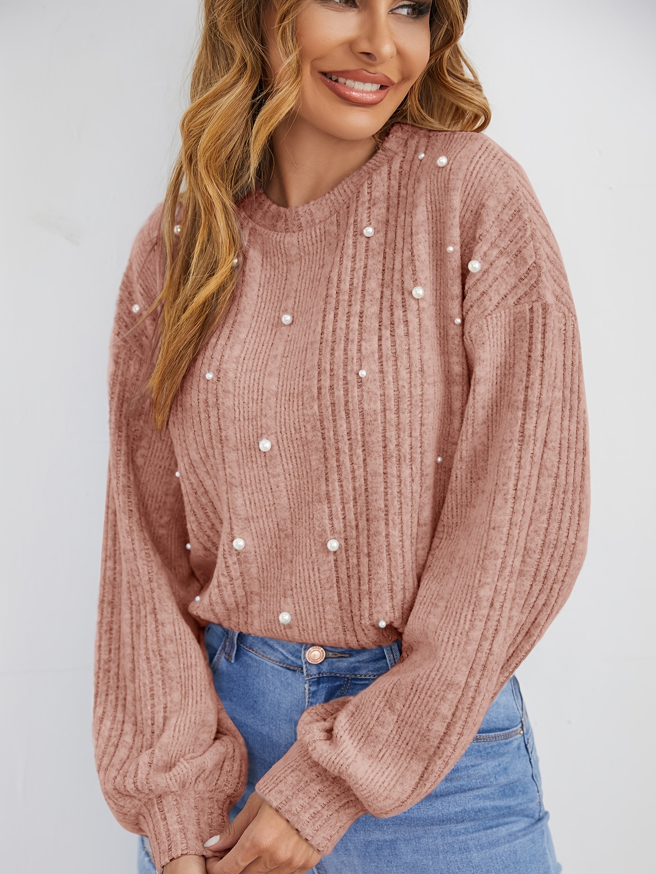 Pull élégant pour femmes à col rond avec perles texturées – Doux comme le suédine, extensible moyen, haut décontracté chic toutes saisons
