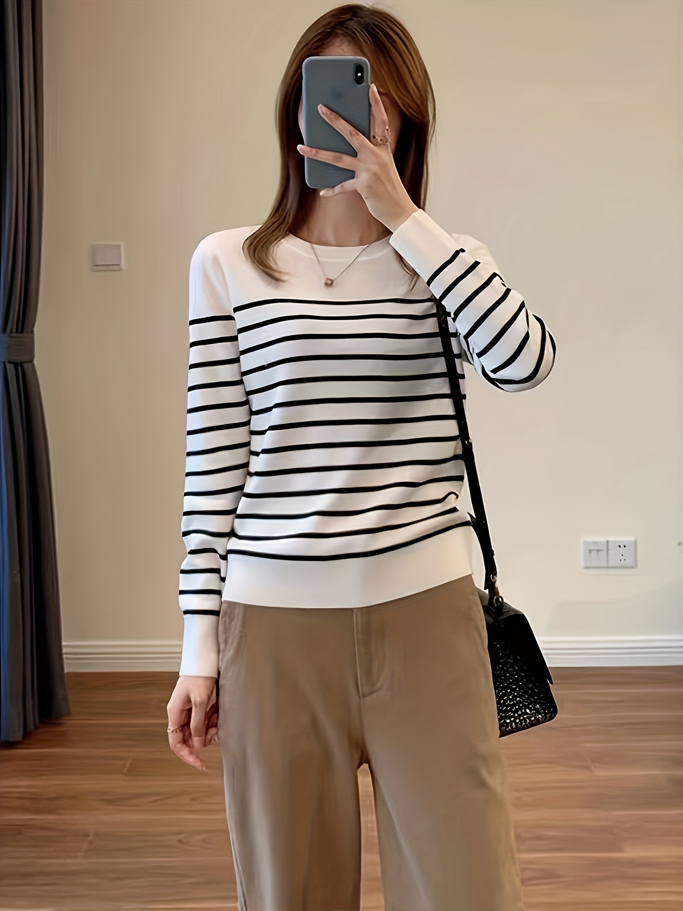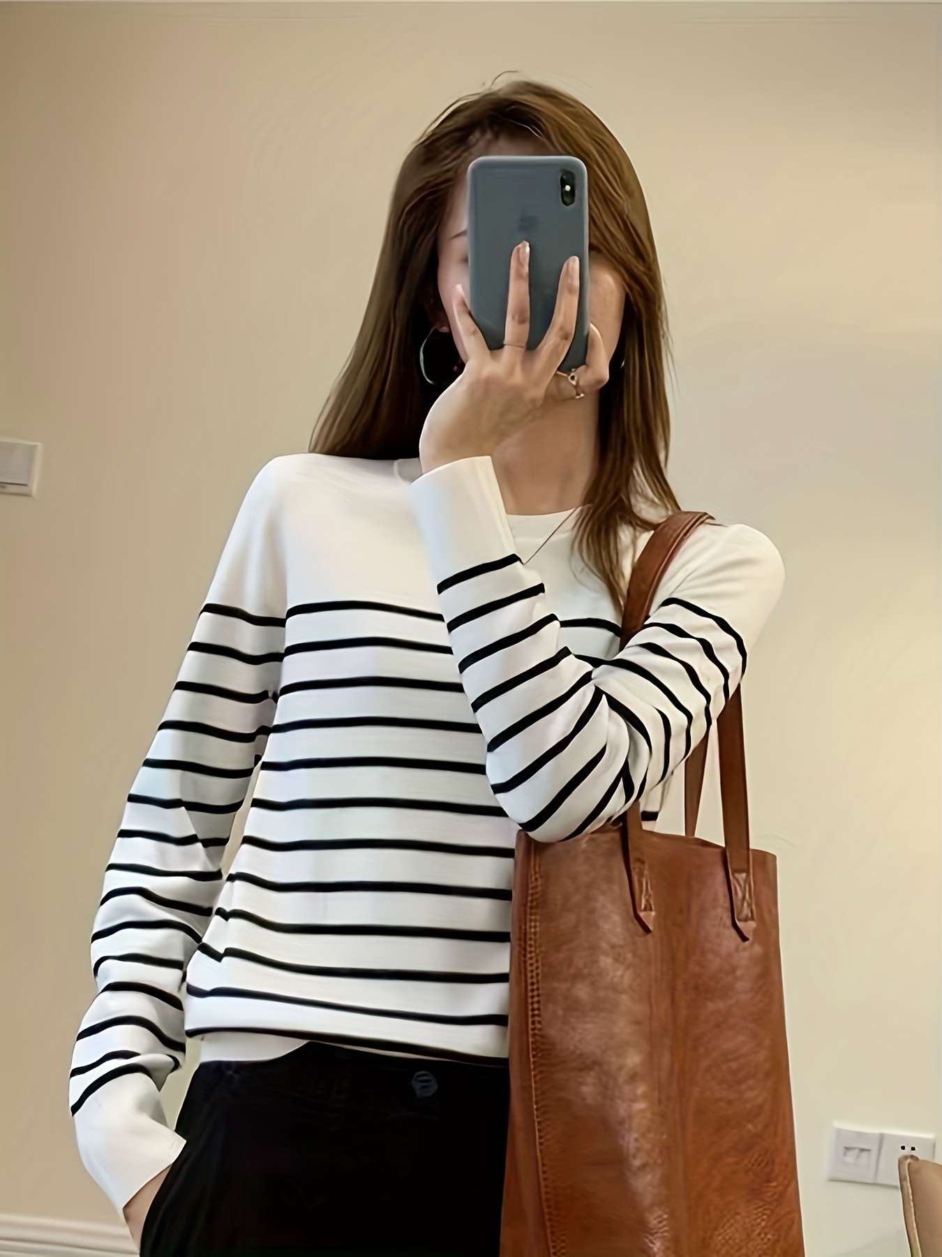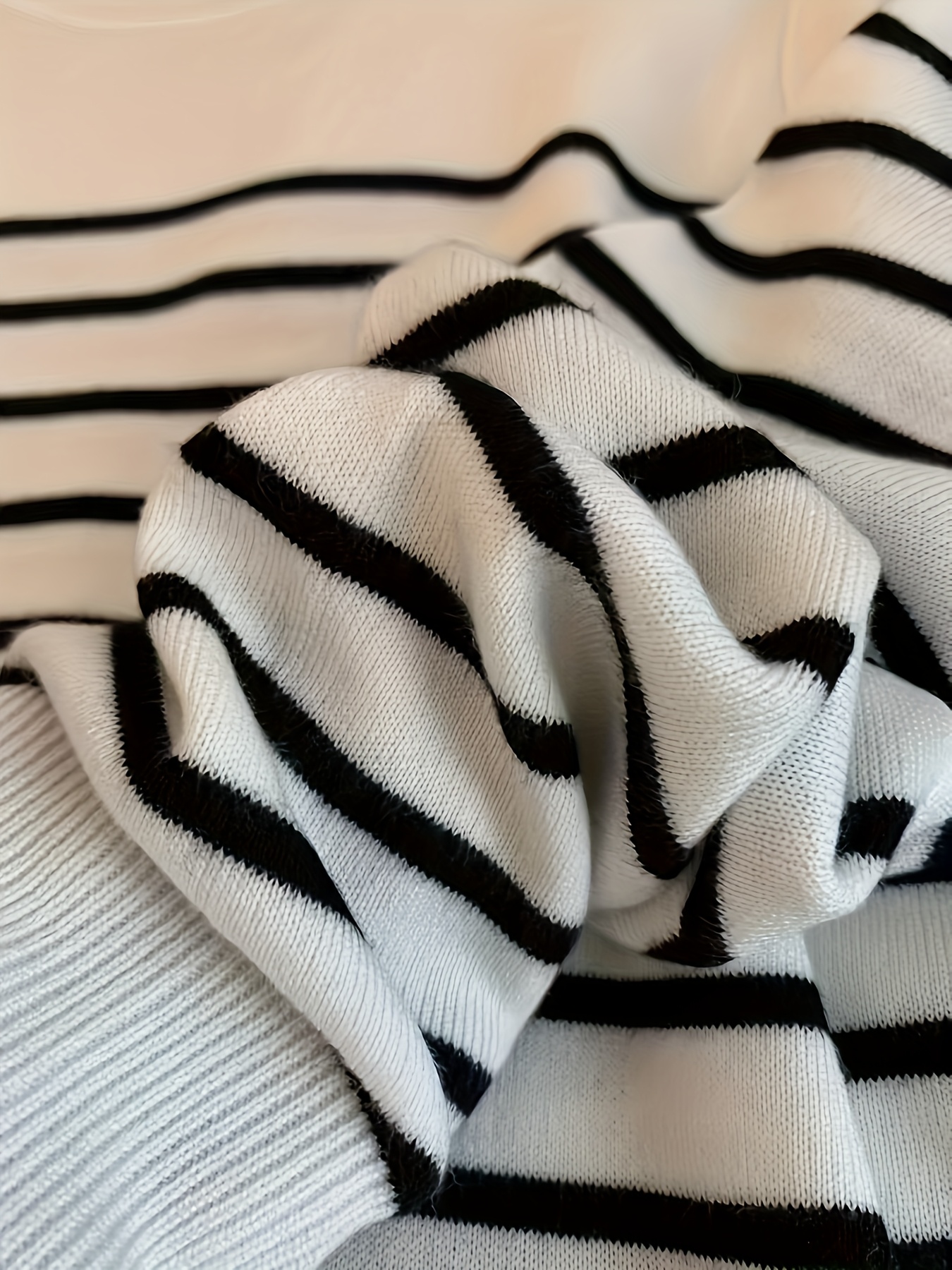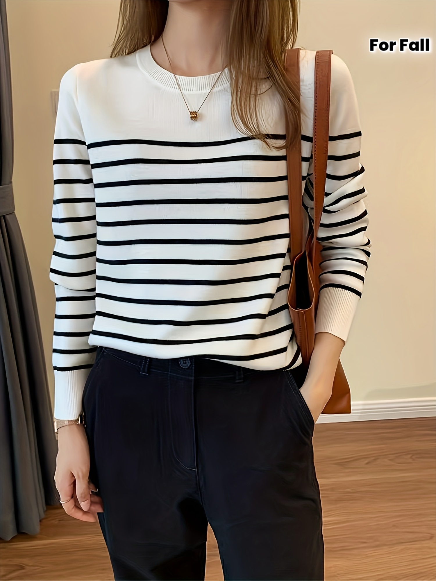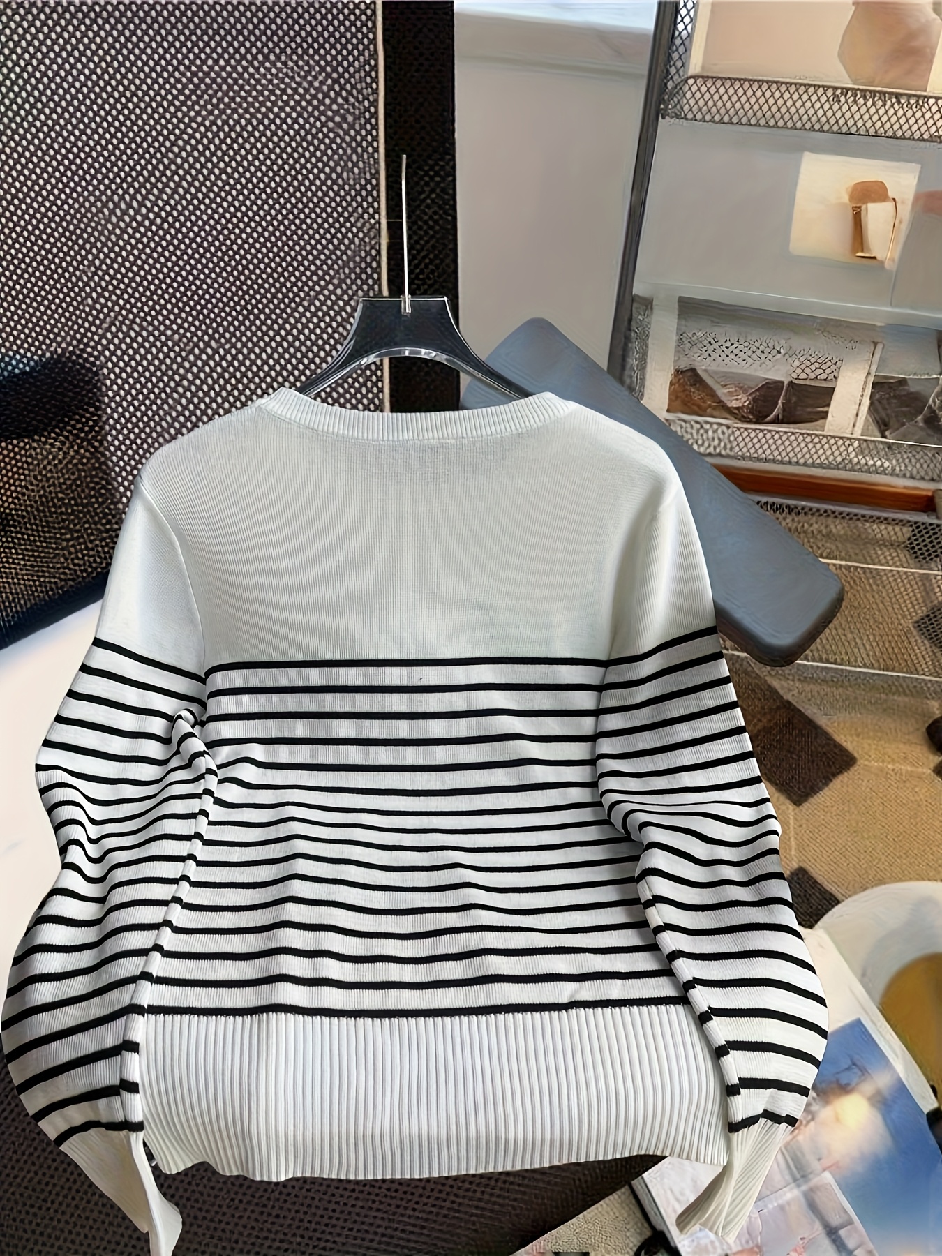 Pullover Femme à Rayures Noir et Blanc Style Coréen – Nouveauté 2025 – Manches Longues – Haut d’Automne-Hiver – Couleur Blanche – Tendance en Corée