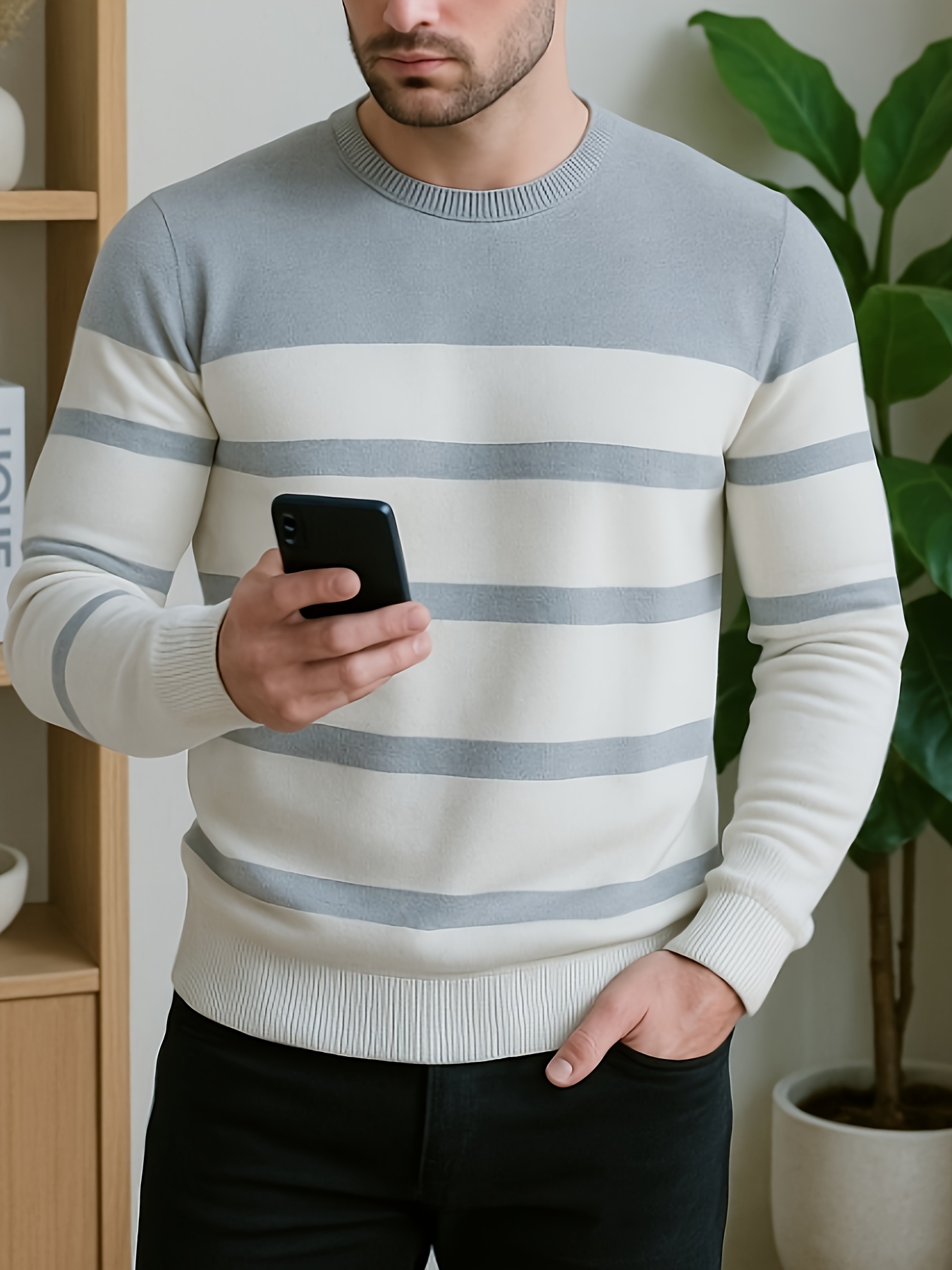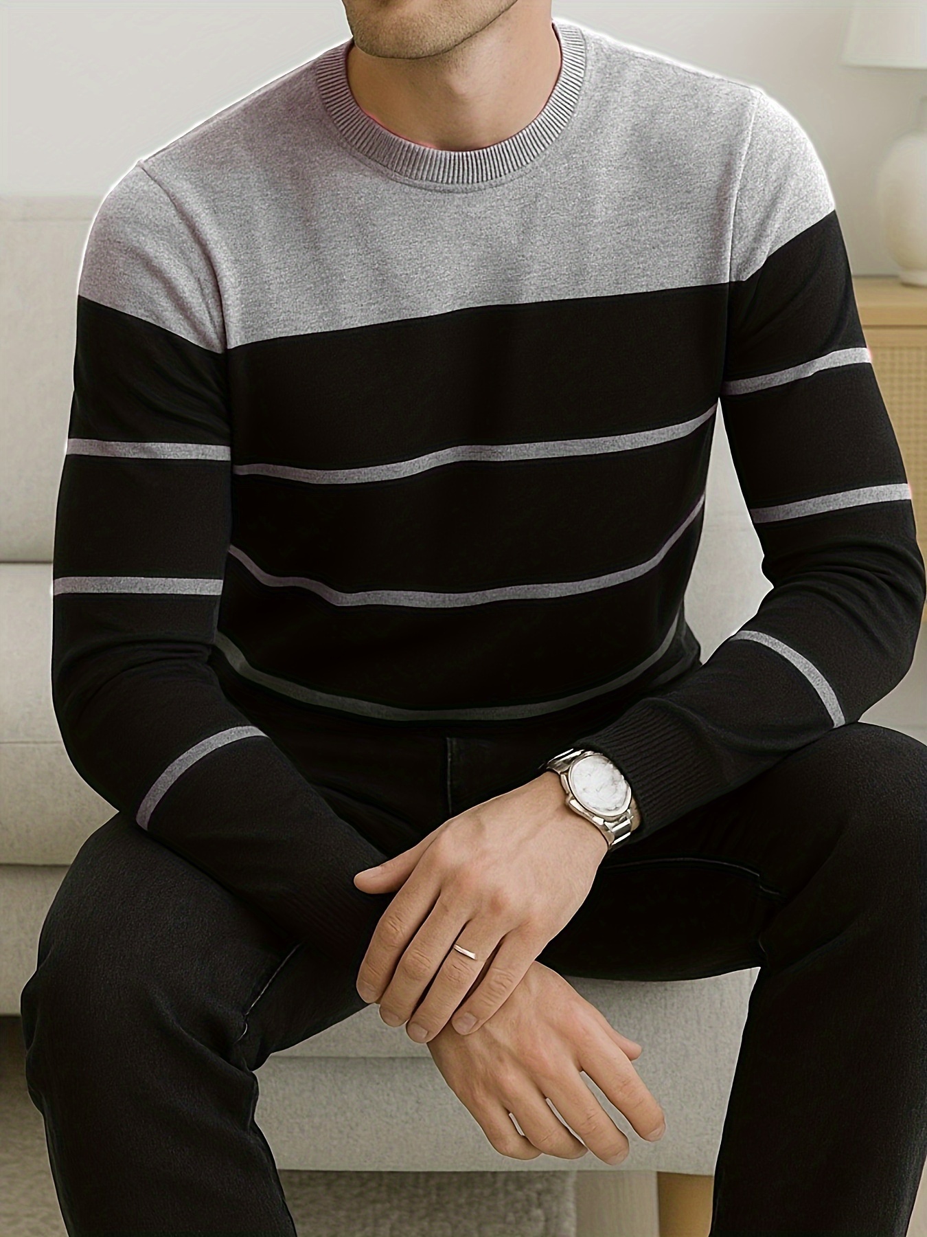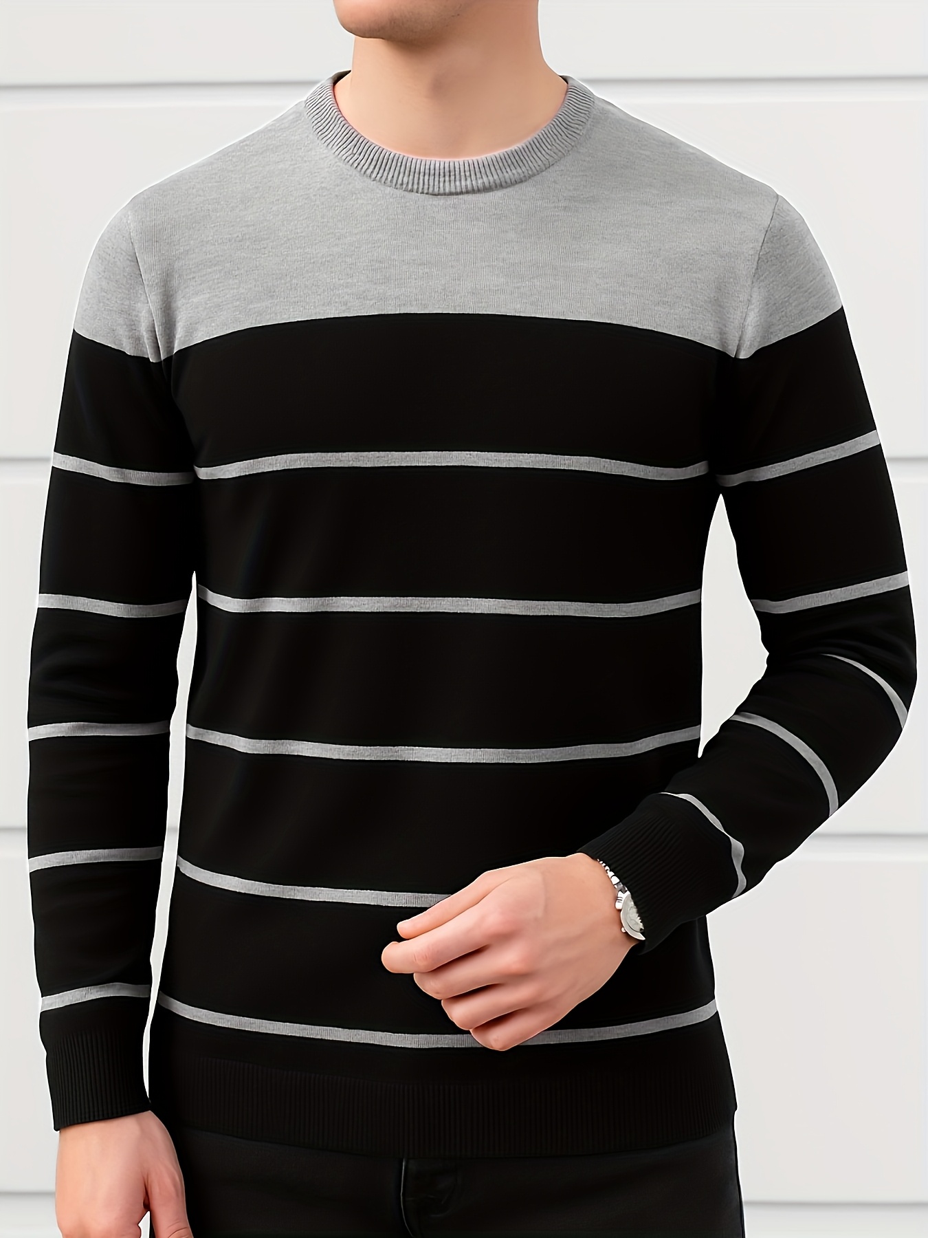 Pullover tricoté pour homme toutes saisons – Rayures horizontales noir et gris, tissu anti-peluche, confortable et extensible, pour tenue décontractée ou formelle – Essentiel pour le bureau et les sorties