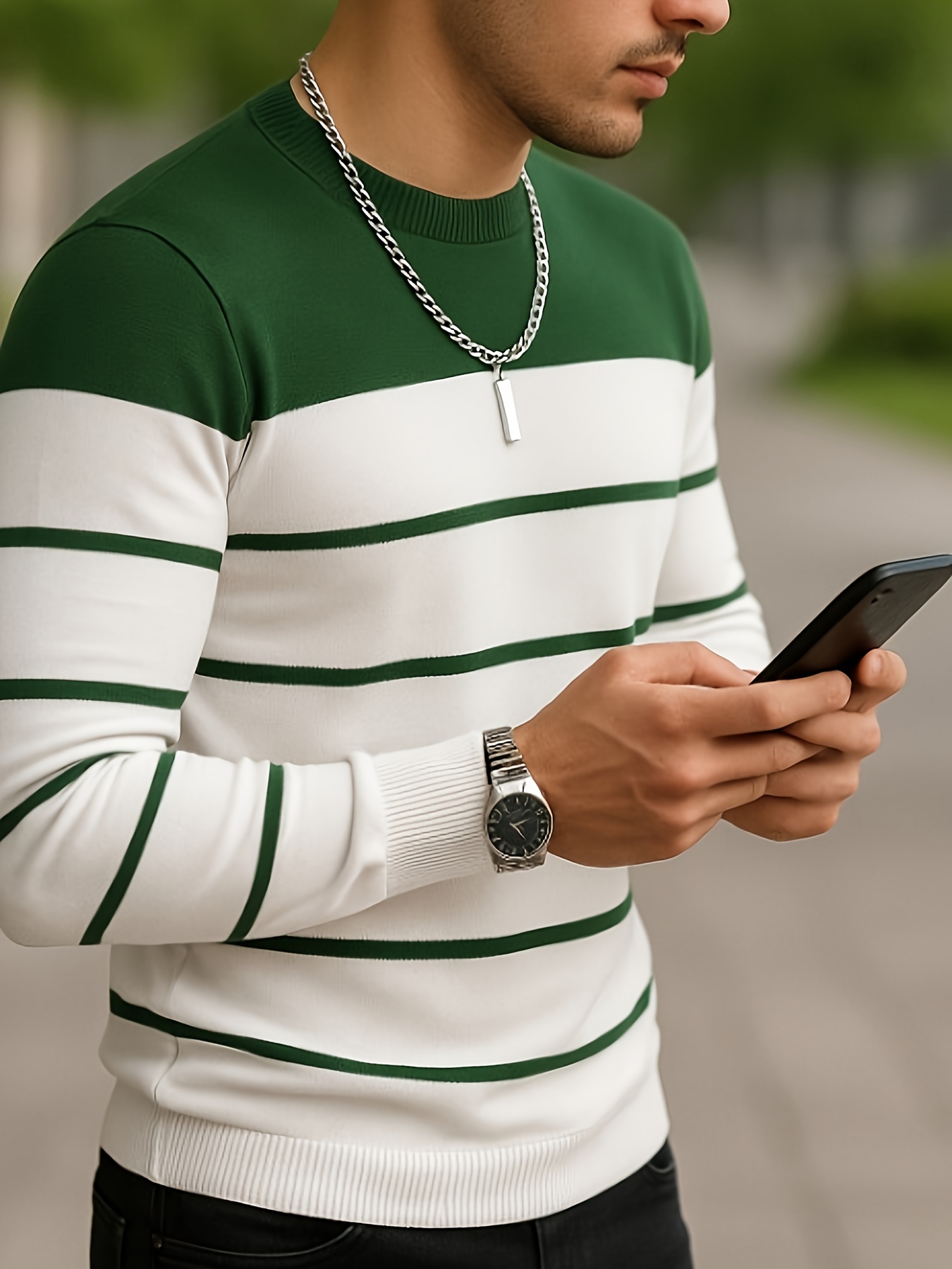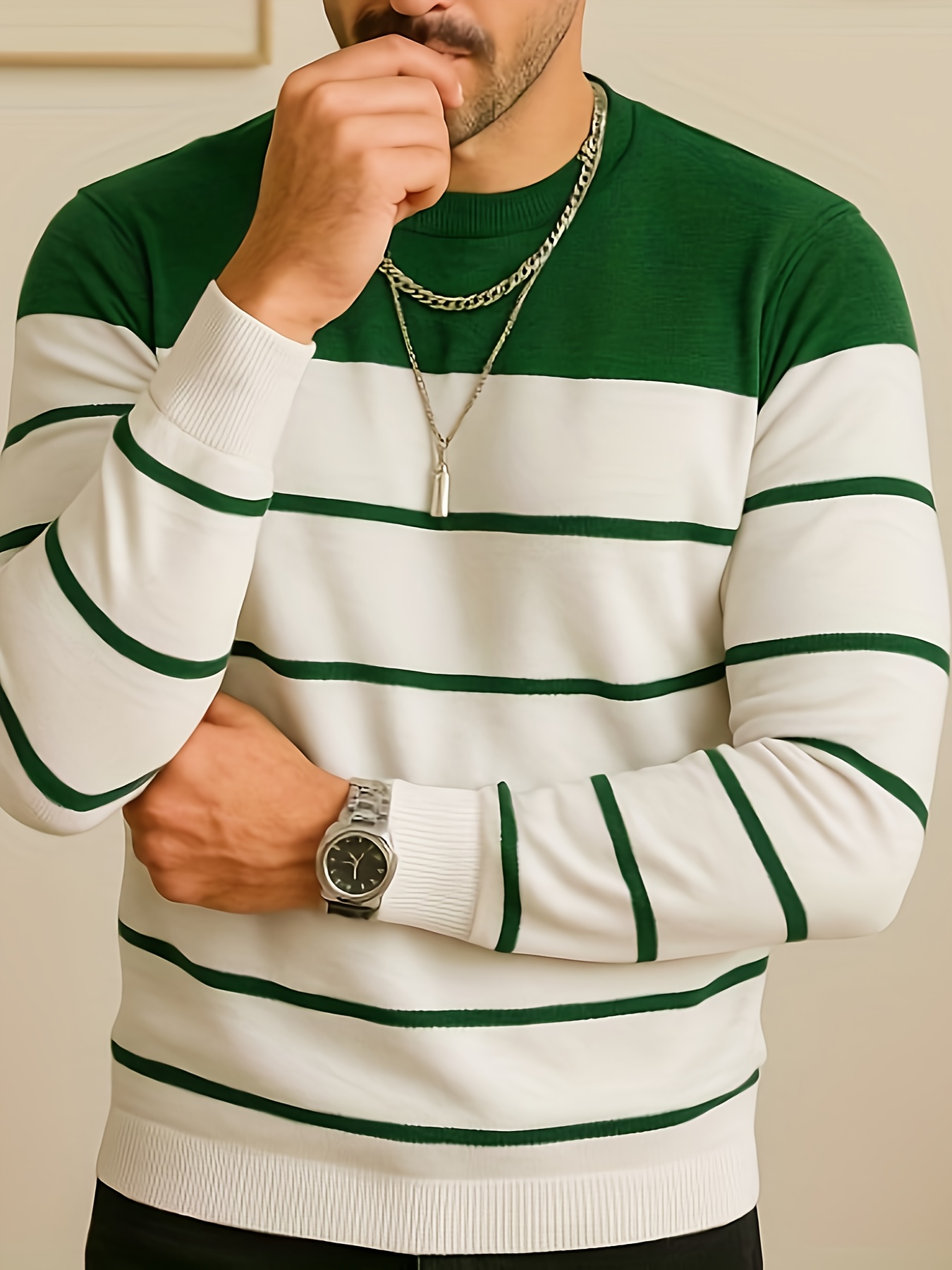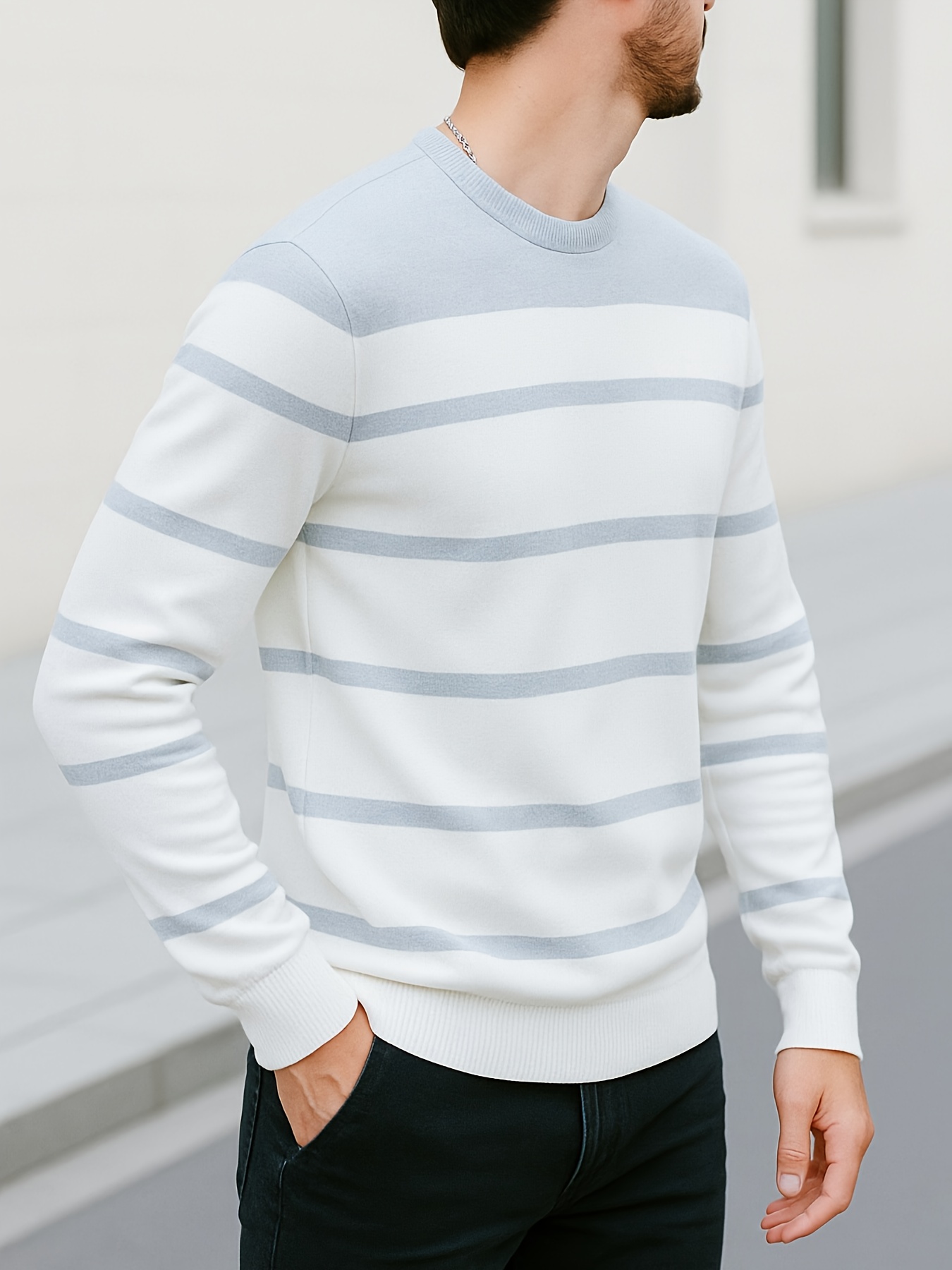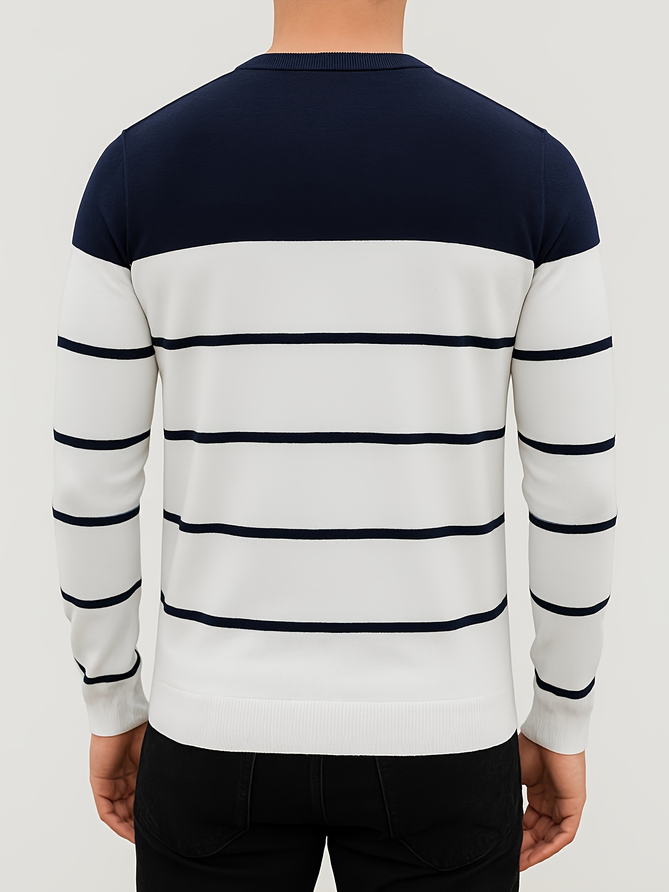 Pullover tricoté pour homme toutes saisons – Rayures horizontales noir et gris, tissu anti-peluche, confortable et extensible, pour tenue décontractée ou formelle – Essentiel pour le bureau et les sorties
